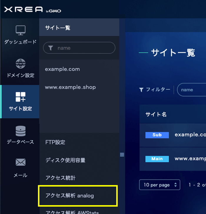 サイト設定ページにある左サブメニューの「アクセス解析 analog」をクリックします。