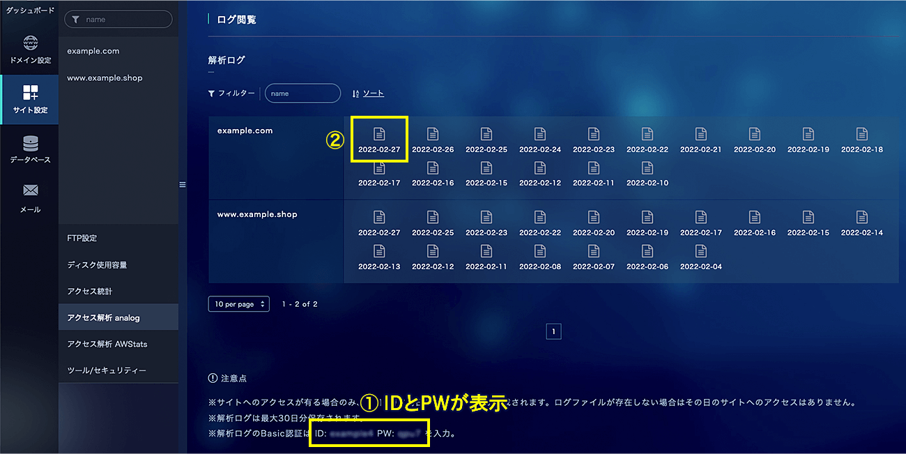 ② 解析ログを確認する日付をクリックします。