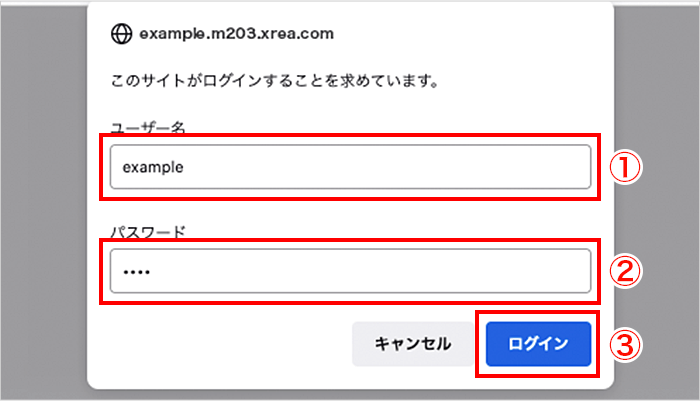 ① 注意点に表示されているIDとPWを確認します。この情報は解析ログを閲覧する際に必要です。