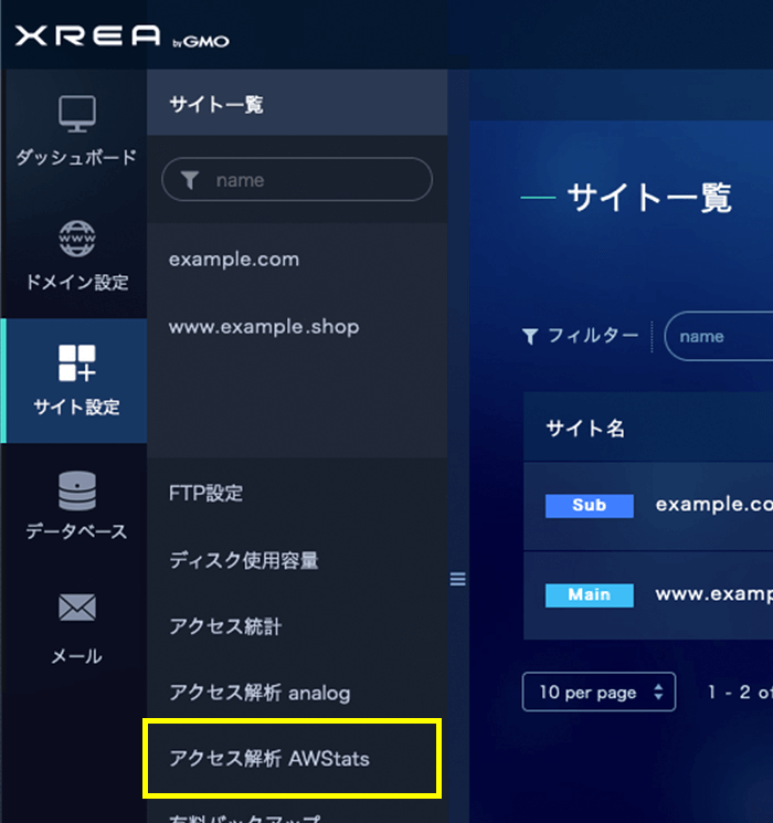 サイト設定ページにある左サブメニューの「アクセス解析 AWStats」をクリックします。