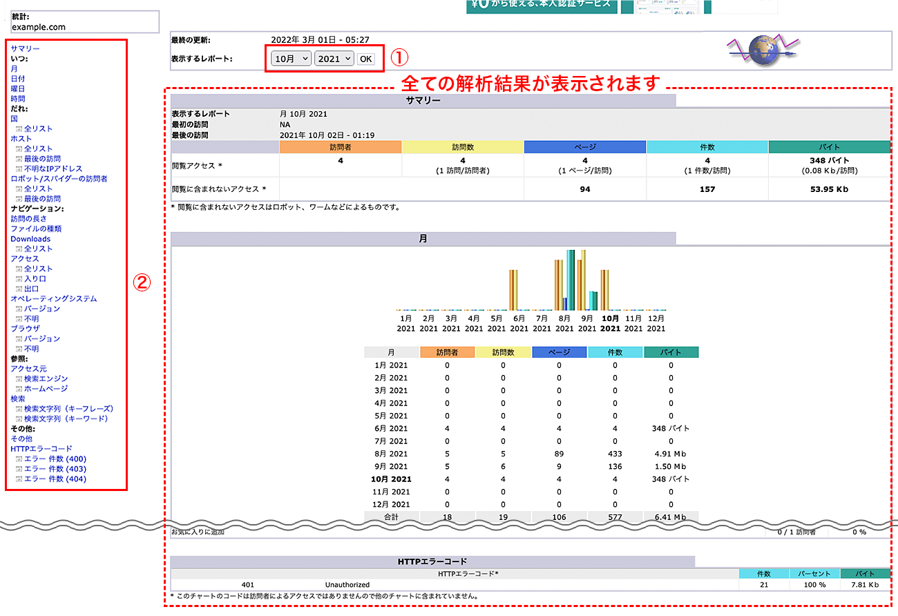 Webサイトへの条件別訪問者数や参照元、エラー数などのアクセス解析を閲覧できます。