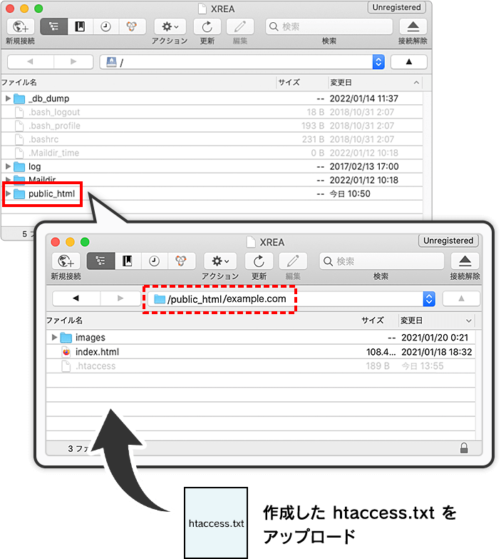 /public_html/ドメイン名※にhtaccess.txtをアップロード※アクセス制限をかけたいサイトのドメイン名を選択します。