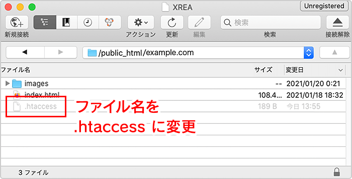 アップロードした htaccess.txt のファイル名を「.htaccess」に変更します。