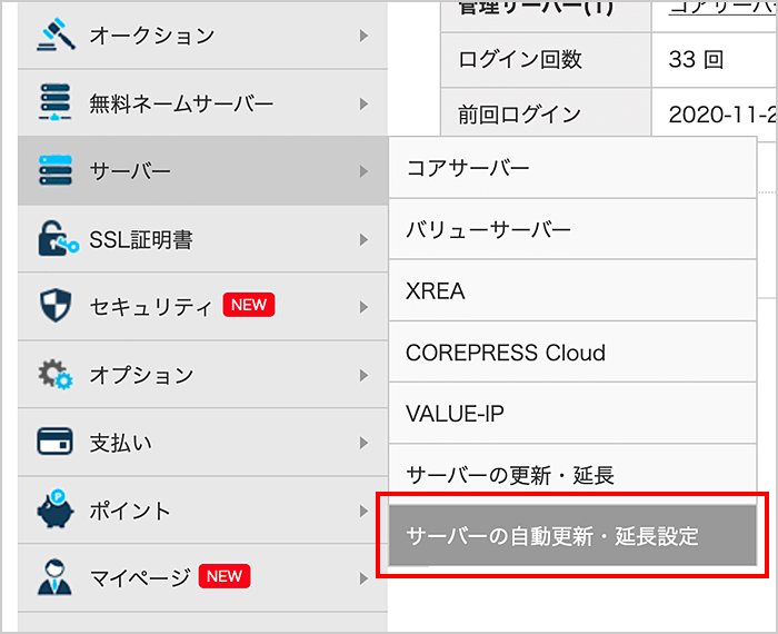 バリュードメインに「ログイン」した後、左側メニューにあるサーバーから「サーバーの自動更新・延長設定」をクリックします。
