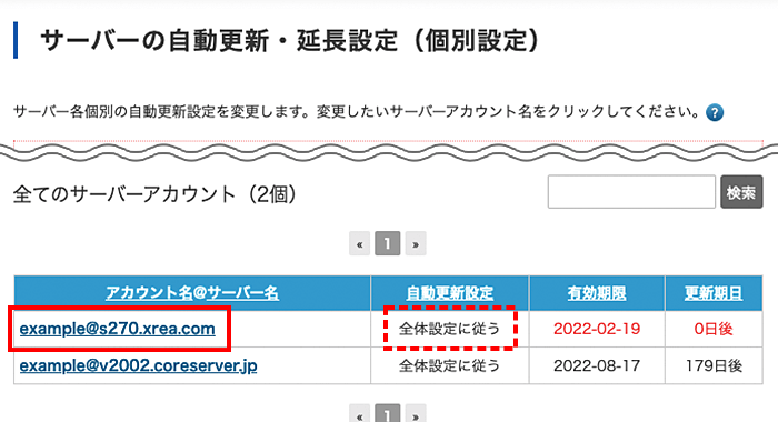 自動更新・延長設定するアカウント名をクリックします。