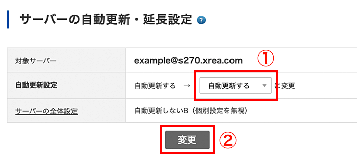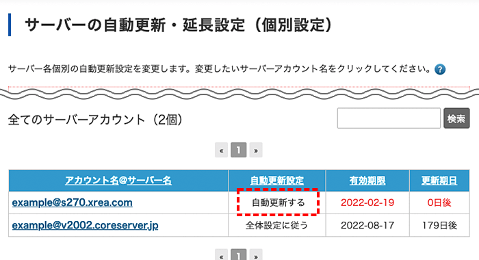 サーバー自動更新・延長設定画面に戻りますので、「自動更新する」に設定されていることを確認してください。