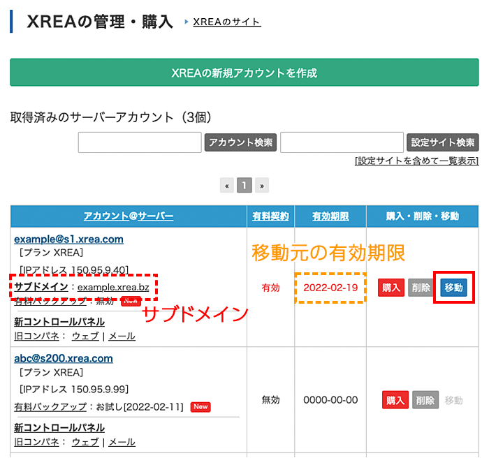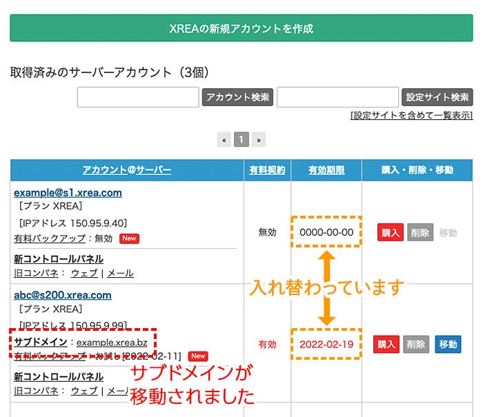 サーバー契約を、異なるアカウントの期限と交換します。期限の追加延長や統合はされません。(移動元が有料プランXREA Plusの場合のみ操作可能です)