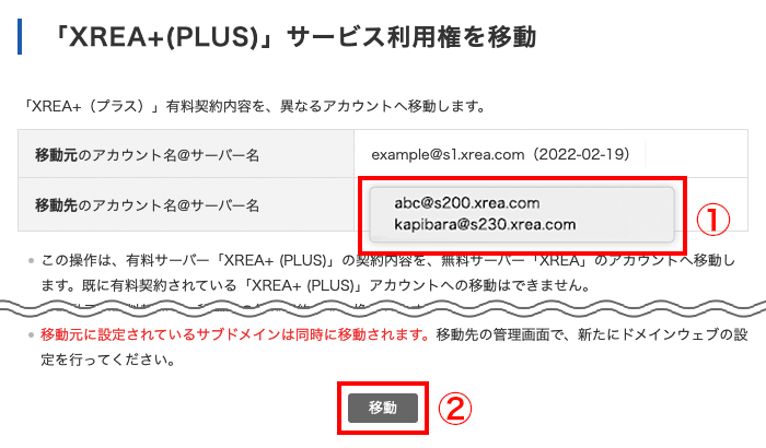 ① 契約期間の移動先のサーバーアカウントをプルダウンより選択