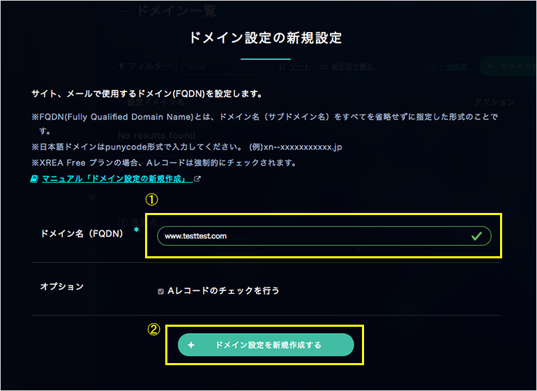 ②「ドメイン設定を新規作成する」ボタンをクリックします。- ※「XREA Free」プランの場合、A(Address)レコードは強制的にチェックされます。