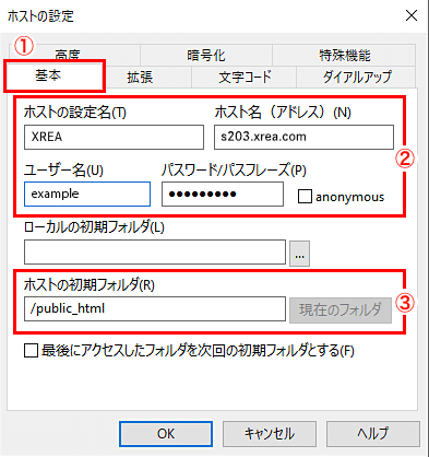 ②ホストの設定情報を入力※ホスト名やユーザー名、パスワードは、弊社よりお送りした「XREA.COM NEW SIGNUP (お客様のサーバー名)」メールに記載されております。