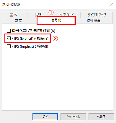 ②「FTPS(Explicit)で接続」をチェックします。 -