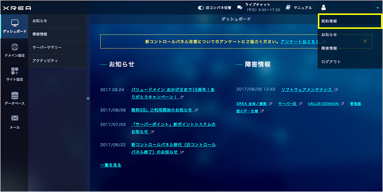 コントロールパネルに「ログイン」後、画面右上にあるサーバー名をクリックすると、プルダウンメニューが表示されます。