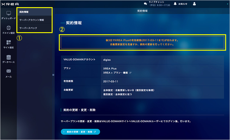 バリュードメインのアカウント名やXREAの契約プラン、有効期限、自動更新の設定などの情報を掲載しています。