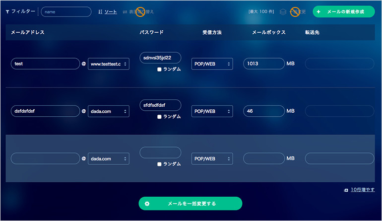 一括変更のテーブルに切り替えます。複数のメールを一度で編集したい場合におすすめです。
