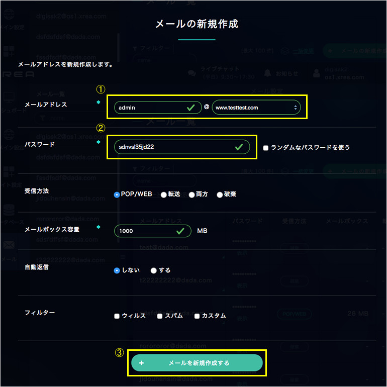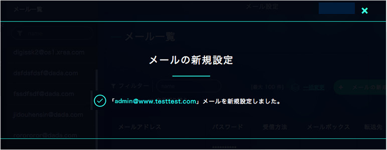 admin @「ドメイン設定」で設定したドメイン administrator webmaster postmaster ②パスワードを設定後、