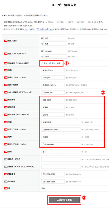「役職」「役職(アルファベット)」「会社・組織名」「会社・組織名(アルファベット)」を入力ください。② 日本語情報の郵便番号を入力すると「都道府県」「市内」「町村」がアルファベットを含め全て自動入力されます。※連絡情報は登録後いつでも変更できます。