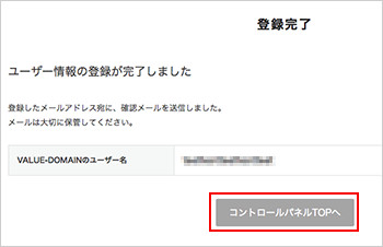 ユーザー登録が完了しました。「コントロールパネルTOPへ」をクリックします。