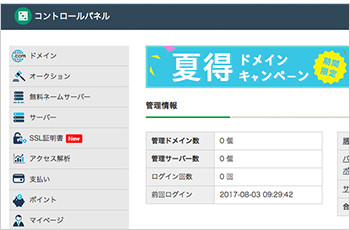登録していただいたユーザー名とパスワードで、ユーザーコントロールパネルに「ログイン」することにより、ドメインやサーバーが一括で管理できます。 「ユーザー登録」から行ってください。