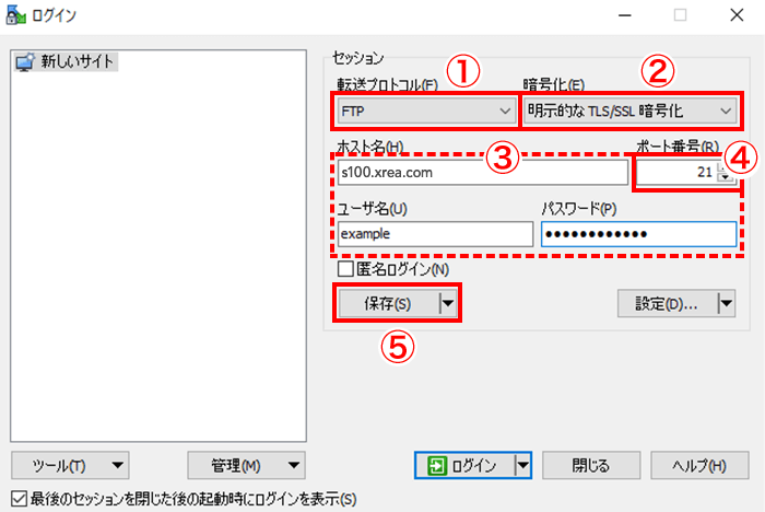 ※ホスト名やユーザー名は「FTPソフト設定情報の確認方法」を参照ください。