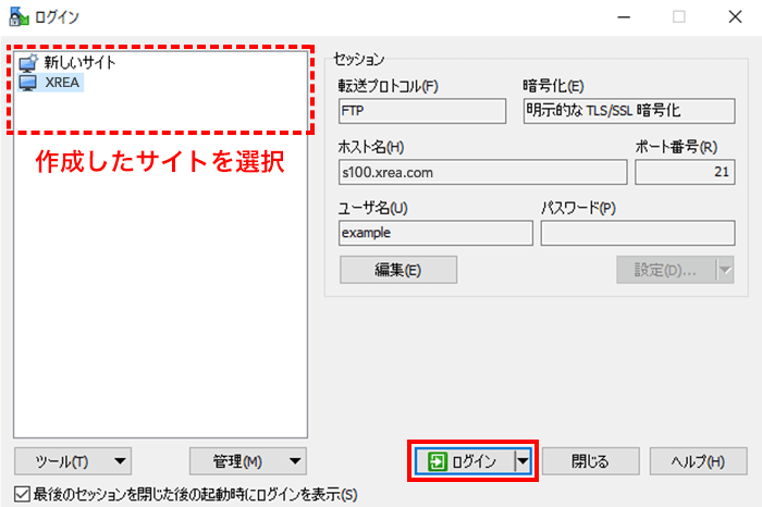 作成したサイトを選択して「ログイン」をクリックします。