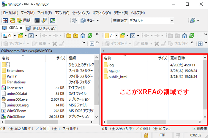 サーバーに接続できました。 右側がXREAの領域となります。