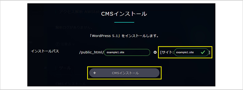 インストール先のパスを指定します。サイトからインストールするドメインを選択して、「CMSインストール」をクリックします。