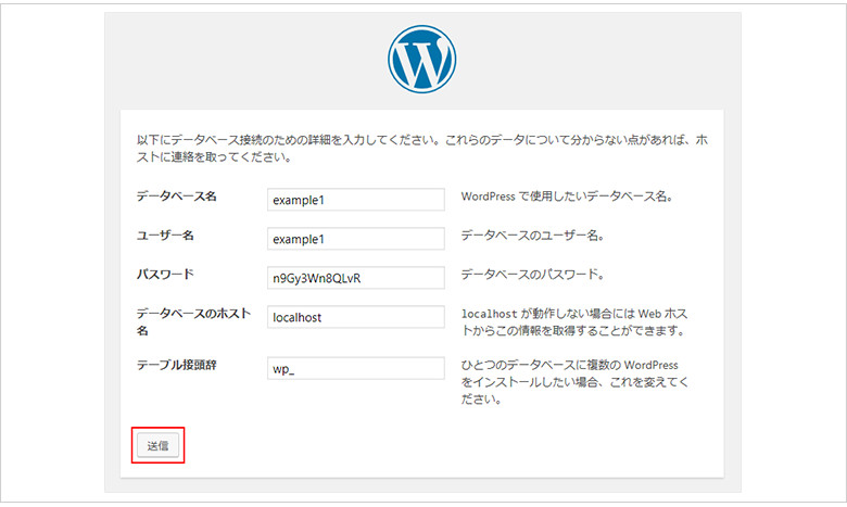 データベース名 作成したデータベース名を使用します。 ユーザー名 作成したユーザー名を使用します。 パスワード MySQL(MariaDB)作成時に設定したパスワードを使用します。 データベースのホスト localhost テーブル接頭辞 任意の半角英数字 -