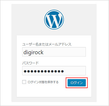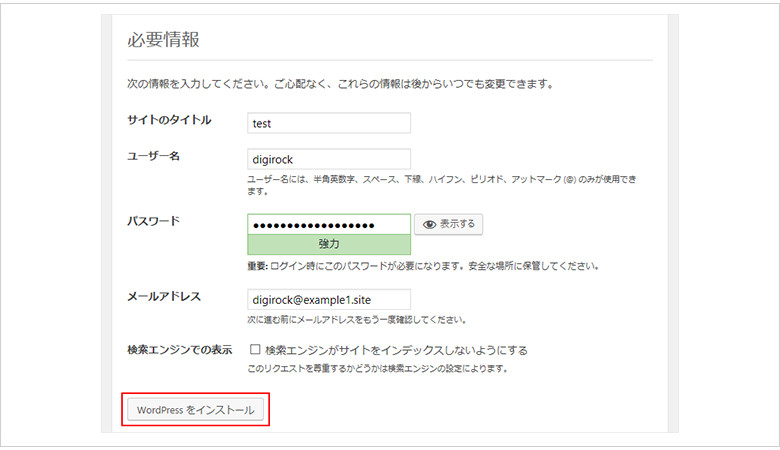 サイトのタイトル 任意のタイトルを設定します。 ユーザー名 任意のユーザー名を設定します。 パスワード 任意のパスワードを設定します。(ログインする際に必要となりますので、メモを取っておいてください。) メールアドレス 利用可能なメールアドレス -
