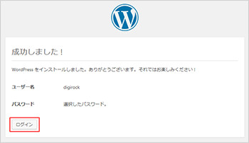 WordPress側のインストールが完了しました。「ログイン」をクリックします。
