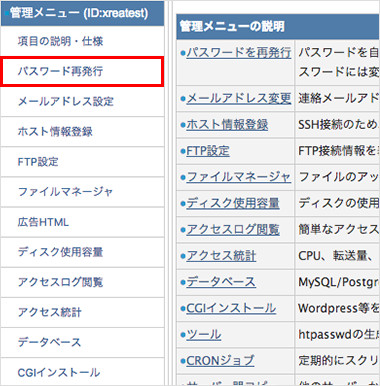 1. 左メニューの「パスワード再発行」をクリック