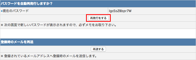 現在のパスワードを確認いただき、変更の必要がある場合は、「再発行をする」をクリックします。